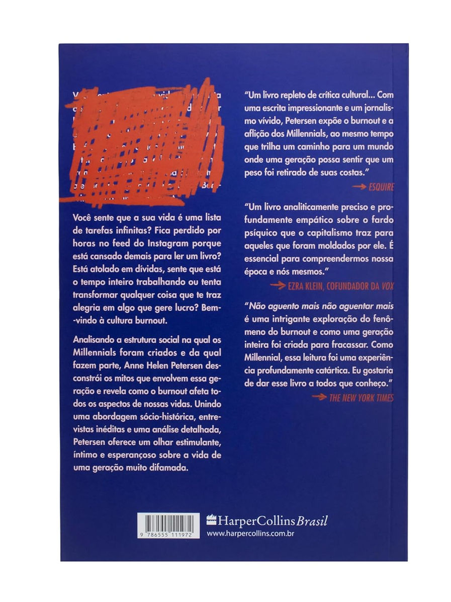 Em Nãoaguento mais não aguentar mais , Anne Helen Petersen desmitifica a falácia de que o trabalho pesado pode conquistar qualquer coisa. O esforço constante leva à exaustão, que é agravada pelas redes sociais e pela busca contínua pela “vida ideal”. Unindo uma abordagem sócio-histórica, entrevistas inéditas e uma análise detalhada, Petersen oferece um olhar estimulante, íntimo e esperançoso sobre a vida de uma geração muito difamada.